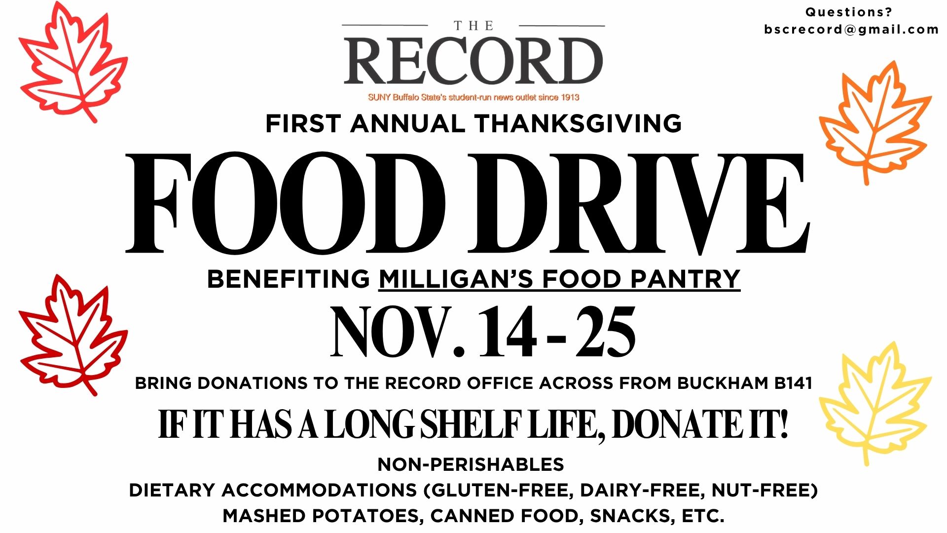 This Thanksgiving season, The Record is proud to announce the first annual “Thanksgiving Food Drive” to benefit Milligan’s Food Pantry and the Buffalo State Community.